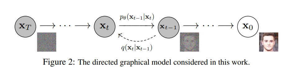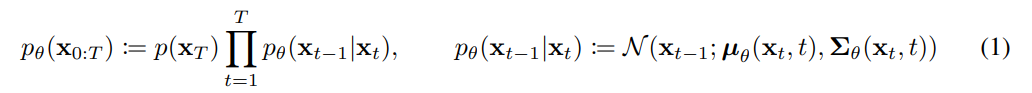 p(x_(t-1) | x_t) : noise에서 image로의 방향, t에서 t-1의 시간만큼