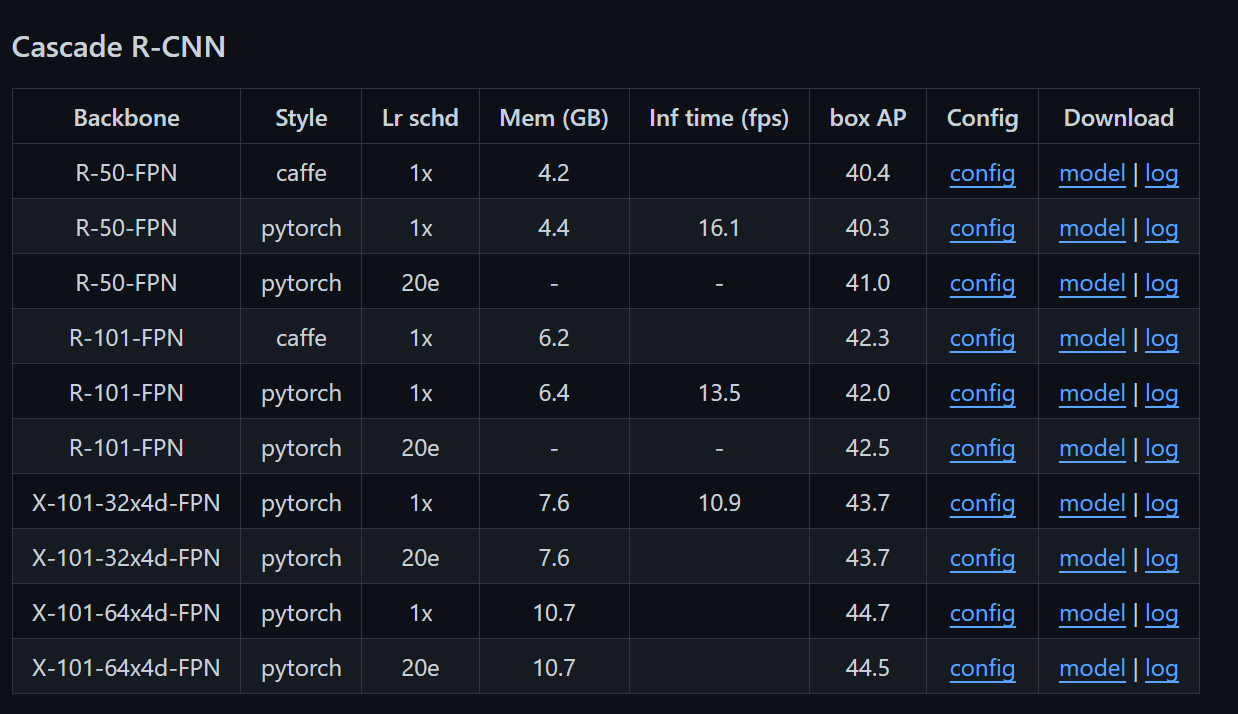 mmdetection readme에 정리된 box AP 성능이 더 높고,