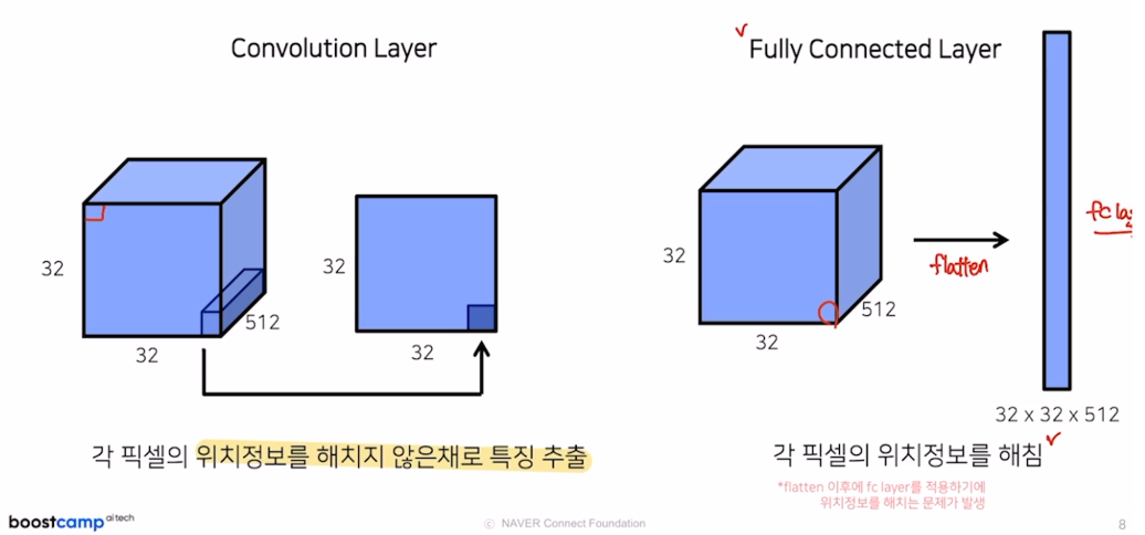 기존 Fully Connected Layer는 flatten과정에서 픽셀의 위치정보를 해치게 된다.
